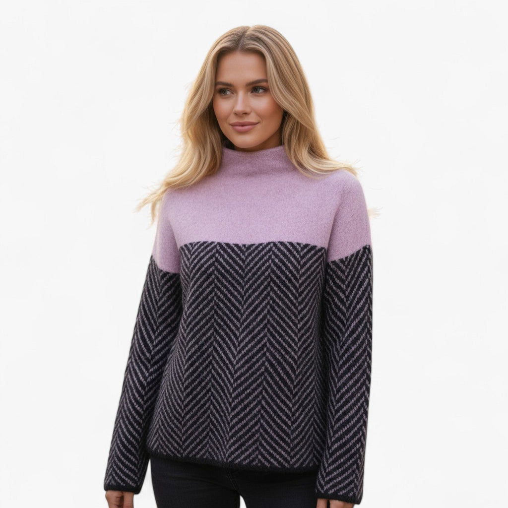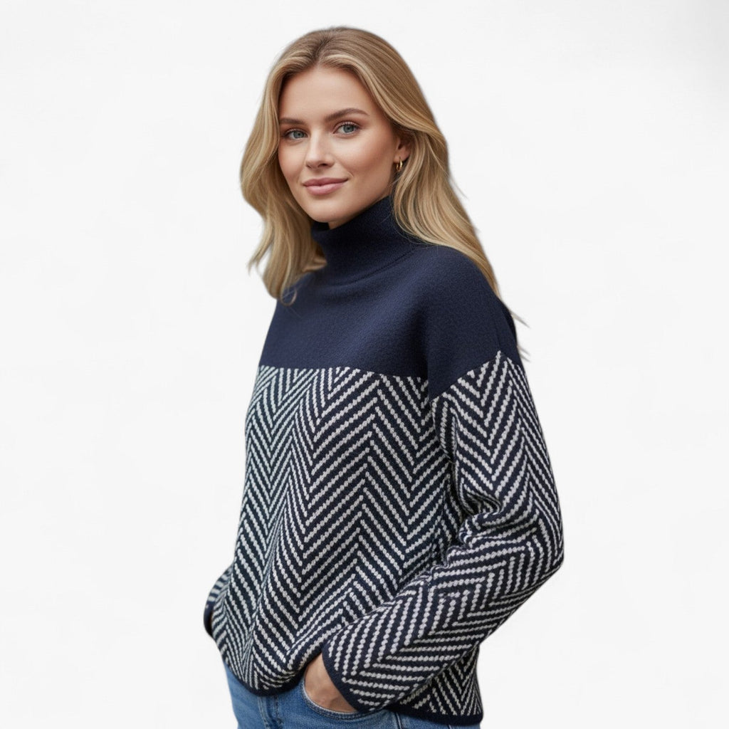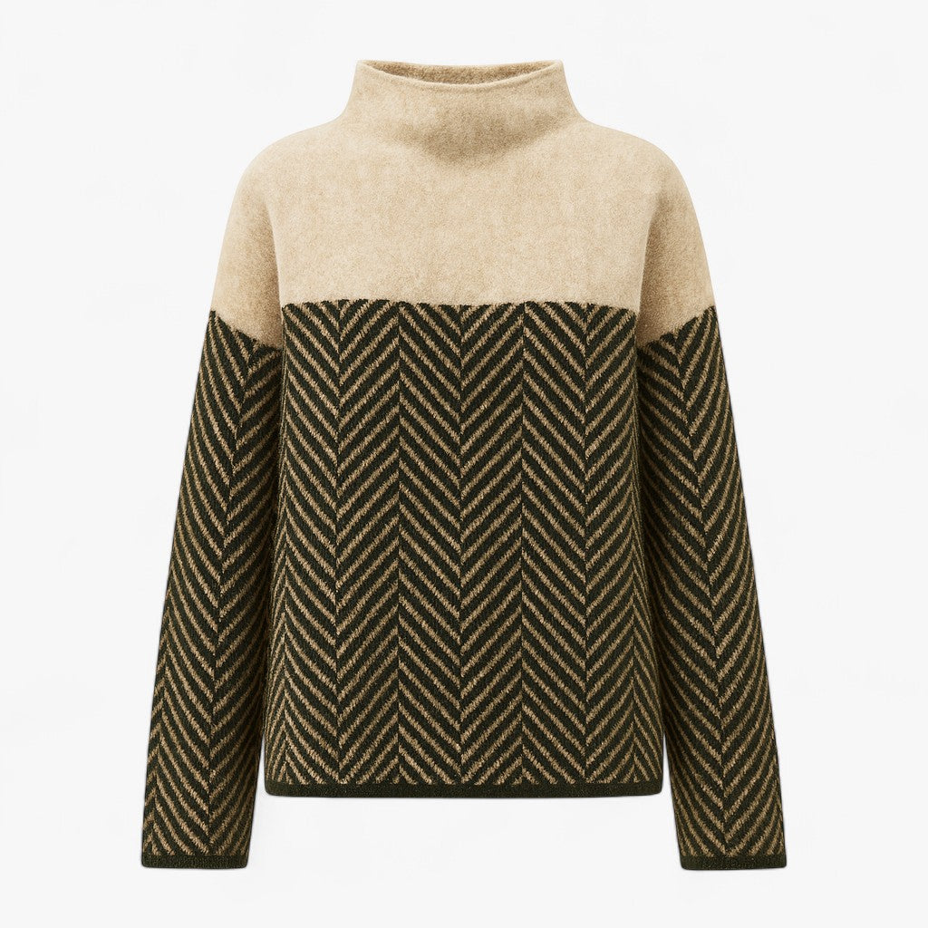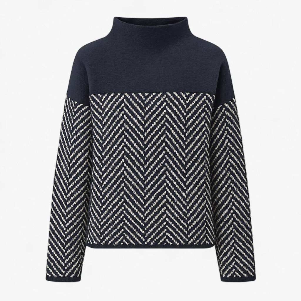 Deze damestrui met hoge hals combineert moderne elegantie met heerlijk draagcomfort. Het tweekleurige design met subtiel zigzagpatroon zorgt voor een eigentijdse uitstraling, terwijl de zachte stof je warm houdt tijdens koelere dagen. Perfect te combineren met jeans of een rok voor een stijlvolle casual look.